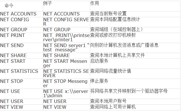 下表列出了基本的NET命令及它们的作用: