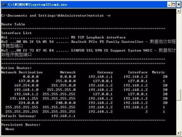 上图显示的是一个路由表,其中:Network Destination表示目的网络,0.0.0.0表示不明网络,这是设置默认网关后系统自动产生的;127.0.0.0表示本机网络地址,用于测试;224.0.0.0表示组播地址;255.255.255.255表示限制广播地址;Netmask表示网络掩码,Gateway表示网关,Interface表示接口地址,Metric表示路由跳数。