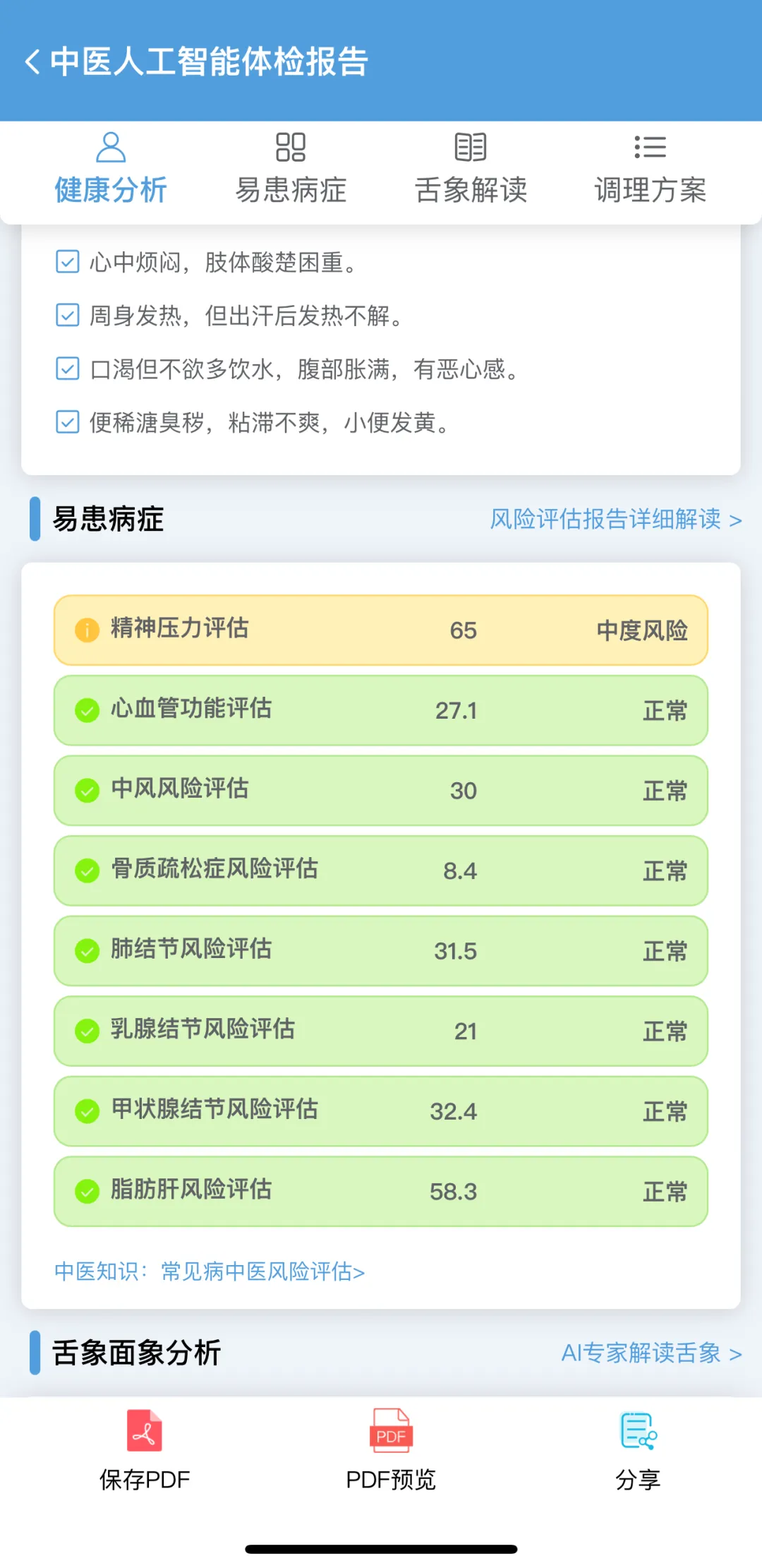 平台通过智能问卷进行抑郁倾向及焦虑倾向人群筛选,同时采集舌面象数据,结合常见体征问诊,对焦虑、抑郁的30余种证型进行辨识,得到相应的情志疾病体检结果,并给出个性化调理方案,帮助用户恢复心理健康。
