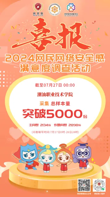 潮汕职业技术学院在揭阳网络空间安全协会的推荐下成为2024调查活动的支持单位,活动期间积极配合调查活动组委会的工作部署,组织广大师生积极参与活动,共采集到5033份网民参与答题样本,为2024调查活动的成功举办做出了突出贡献。