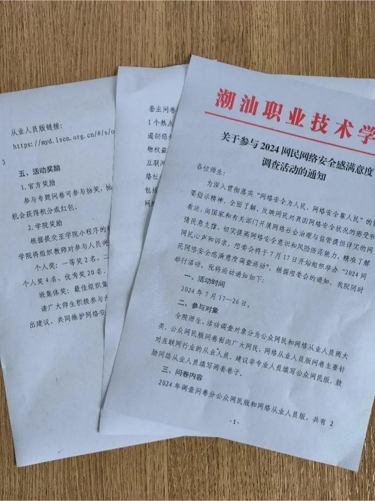 方案设计。潮汕职业技术学院(以下简称“学院”)是揭阳调查活动主办单位揭阳网络空间安全协会的理事单位,多年来长期参与协会的网络安全学术交流工作和等级保护定级技术交流工作。活动筹备阶段,学院网络与信息化中心及时与协会对接,了解2024年调查活动的组织模式,及时获取学院专属问卷入口链接二维码,并针对活动时段处于暑假期间的特点,与思政老师们多次讨论,逐渐形成学院调查活动组织方案。