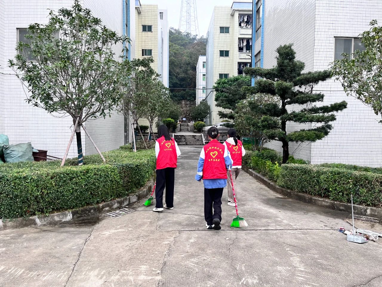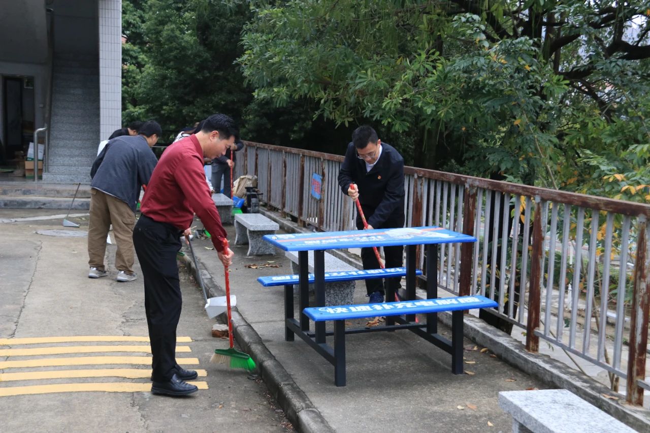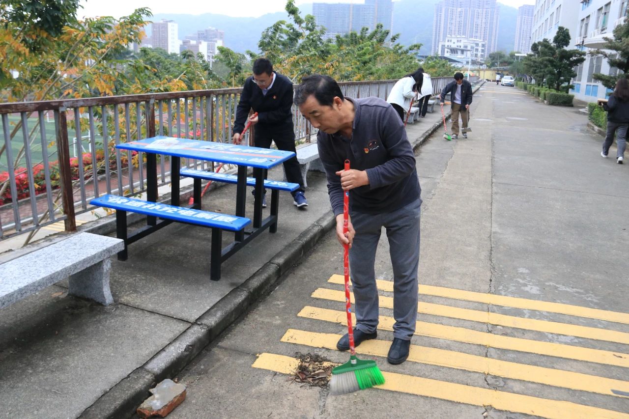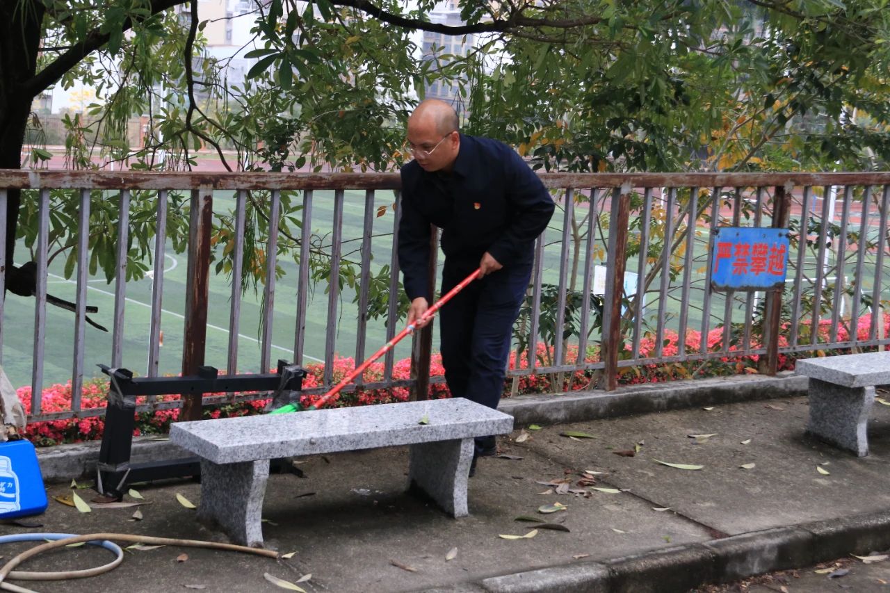 师生党员们分组行动,手持清洁工具深入潮韵广场、文化长廊、教学楼、校道、运动场、食堂、师生宿舍楼等区域,清扫路面落叶、擦拭公共设施、清理卫生死角。劳动过程中,党员师生们分工协作,干劲十足,充分展现了不怕脏、不怕累的奉献精神。经过集中清理,校园环境焕然一新,师生们的劳动成果获得来往师生的频频点赞。