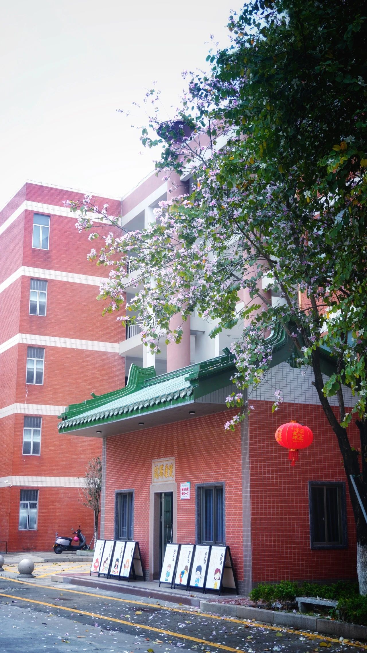 健康驿站前垂落的粉色紫荆